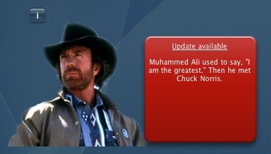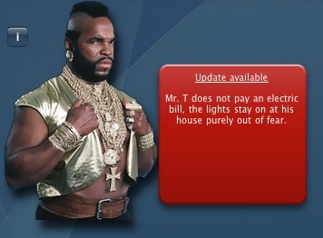 Welcome to the homepage of The Chuck, Vin and T widget. If you haven't seen the latest craze of writing facts about these three individuals then you're probably in the wrong place, try here. Essentially this widget randomly selects Chuck, Vin Diesel or Mr T. It then goes away and grabs a random fact about them and displays it. It also shows a nice purty picture to go along with it. Features?